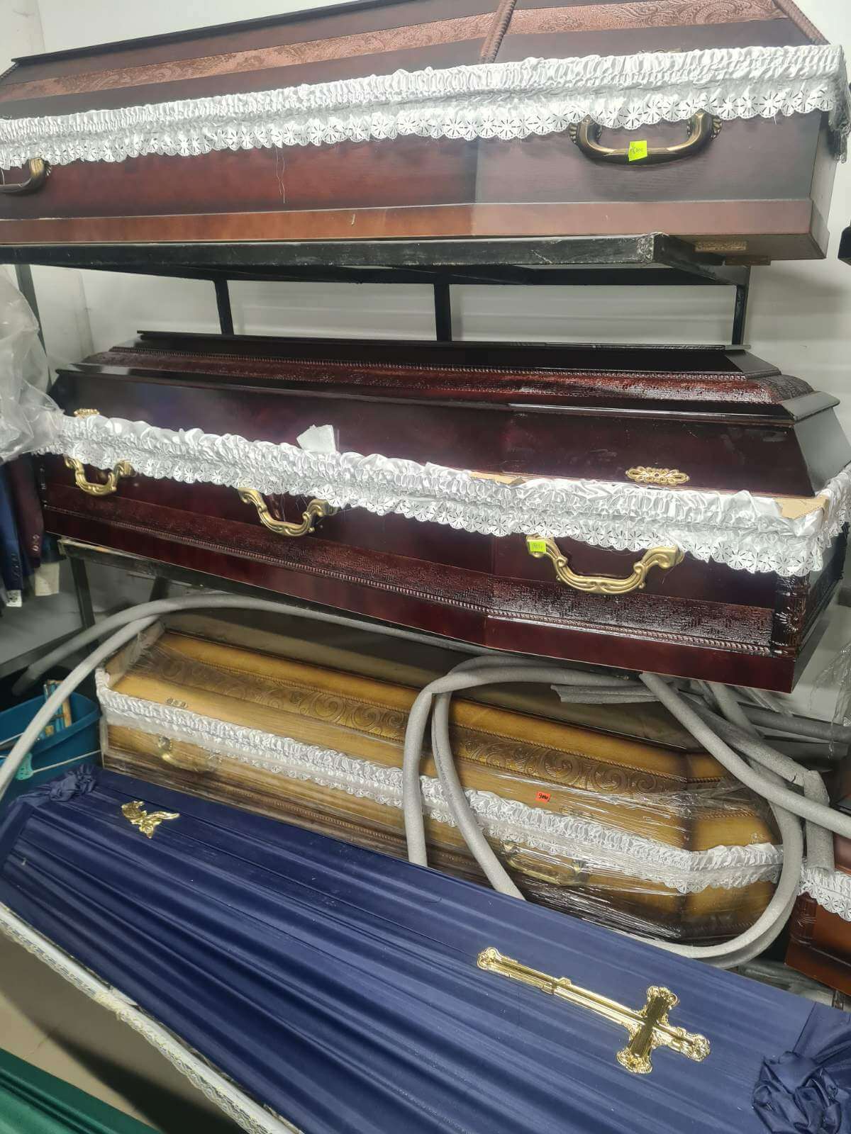 Набагато рідше для виготовлення ритуального виробу використовують метал. Цинкові труни вибирають для перевезення тіла на великі відстані для забезпечення кращого його збереження.